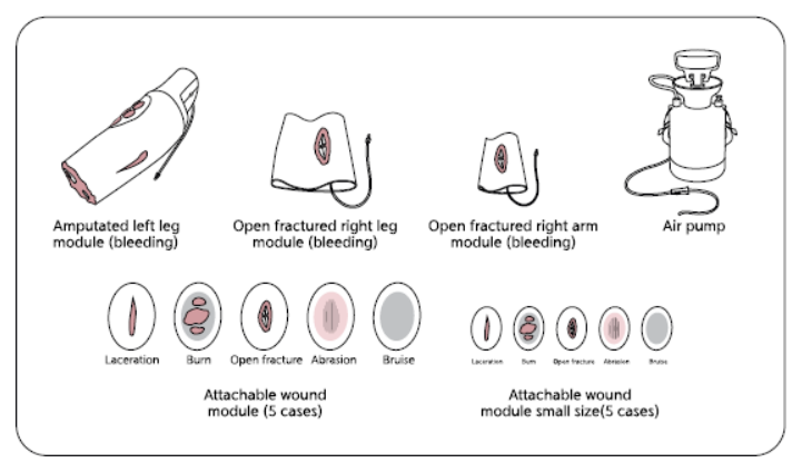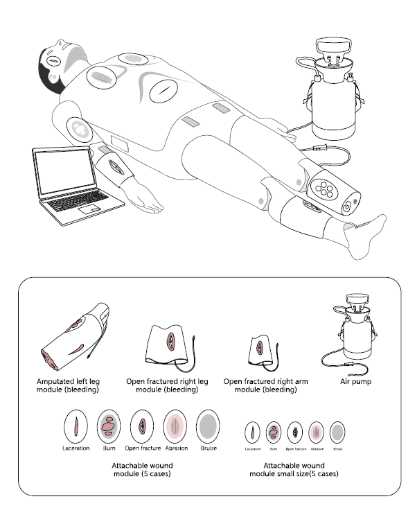 • Attachable wound module (laceration, burn, open fracture, abrasion, bruise)